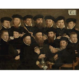 A gathering of the bearded men of the Amsterdam crossbow militia guild. Together with the longbow archers and the harquebusiers, they defended the city against attacks from outside and unrest from within the city walls. They practiced at their target ranges called Doelen. However, the bow cannot be drawn all the time. In addition to target practice, members also relaxed by eating and drinking. There is a jug of wine on the table and to the top left, a member is holding a note with the inscription ‘in vino veritas’: in wine there is truth. This crossbow guild commissioned its group portrait from Dirck Barentsz, a Dutch painter who had just returned from Venice, where he had worked in the studio of the famous Titian. The Italian influence can be seen in the vibrancy of the group composition. Group portraits of militia guild members were proudly displayed on the walls of the buildings of the civic guard in the cities of Holland. Increasingly so in the years that would follow… - Before you enter the Great Hall, please activate your audio player, to the left of the entrance.