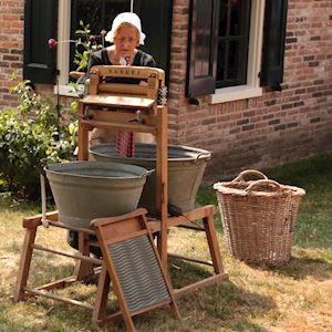 Een oudere Gieterse vertelde hoe haar moeder na een intensieve werkweek op zaterdag tegen haar vader zei: ‘Je moet je wel verschonen’. Hij antwoordde dan soms: ‘Nee hoor, dat heb ik vorige week al gedaan’. Kleren werden namelijk maar een keer in de twee weken gewassen. Het was een heel karwei, dat twee tot drie dagen duurde. Eerst moest het wasgoed een nacht in de soda weken, daarna werd het gekookt en geborsteld op het wasbord. Dat was op maandag, wasdag. Het witgoed ging op de bleek, dat wil zeggen dat het op een grasveld werd uitgespreid. Door het zonlicht verdwenen de vlekken. Dan moest het donkere goed nog in de was. ’s Avonds werd alles uitgespoeld - niet in de sloot maar in het meer, daar was het water schoner. Dan moest het nog in de wringer, en daarna gedroogd, gesteven en gestreken. Het stijfsel maakte de stof stug. De Gieterse vertelde wat dat met een zakdoek kon doen: ‘Sommigen hadden bij het snuiten een snee in de neus’.