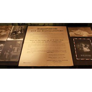 Während Hunderttausende Männer an der Front kämpfen, bleiben genauso viele Frauen zu Hause zurück. Auch für sie ist der Erste Weltkrieg eine sehr einschneidende Periode. In Abwesenheit ihrer Männer übernehmen sie wichtige Rollen. Sie arbeiten am Land, als Arbeiterinnen in den Fabriken oder als Zugschaffner. Oder sie helfen als Krankenschwestern in den zahlreichen Kliniken aus oder landen in der weniger glücklichen Position als Prostituierte. Die Spritze in der Wandvitrine wurde verwendet, um eine unangenehme Auswirkung der weitverbreiteten Prostitution zu behandeln: Gonorrhö. In Deutschland sorgt der Erste Weltkrieg dafür, dass Frauen nach dem Krieg das allgemeine Wahlrecht erhalten. Als Illustration dient das Pamphlet in der Vitrine mit dem Aufruf für „Frauenwahlrecht“. Die Frauen haben das Land während des Krieges aufrechterhalten und erhalten in Deutschland künftig Wahlrecht. In Belgien wird dies noch einige Jahrzehnte dauern, bis nach dem Zweiten Weltkrieg.