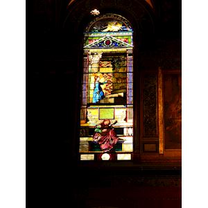 With your back to the altar, look up at another LaFarge window: The Presentation of Mary at the Temple, LaFarge re-creates in glass a portion of the painting by Titian of the same name. LaFarge used the same techniques and vibrant color as he did in the creation of our Christ Preaching window above the center doors. The window depicting The Presentation of Mary is a memorial to Julia Appleton McKim, who was the wife of Charles Follen McKim. McKim worked for Trinity’s architect, Richardson, before starting his own firm, McKim, Mead and White –– These were the architects of the Boston Public Library across Copley Square. The decoration of Trinity church also includes the work of two women artists. Look at the windows in the lower level on either side of you. These were made by Boston stained-glass artist Margaret Redmond and were the last windows installed in 1927. On the left side, you can see a depiction the four Gospel writers. On the right side are Jesus’s twelve Apostles. These windows are a wonderful example of the English Arts and Crafts aesthetic, with deep rich colors and flat images. Redmond had her studio on Newbury Street just a few blocks away from Trinity Church. If you look down at the carpet in the center aisle, you’ll see a reproduction of one of the very first carpets installed in the church. It was designed by Boston artist and parishioner Sarah Wyman Whitman. She was trained as a painter, ran her own stained-glass studio, and was a leader in the Boston art community in the 19th century. A final word as we finish this tour. Trinity Church isn’t a museum. It’s a vibrant, active, and diverse parish with close to 1,000 people worshiping here each Sunday. As we have for almost 300 years, we remain deeply committed to serving Boston with a wide range of ministries, with a special focus on helping the disadvantaged youth of the city. To do this work, and to maintain this historic building, Trinity receives no direct funding from sources other than its own members. The art treasures that you’ve seen are still in the places that they were designed for –– inspiring and uplifting those who view them. Our special thanks to visitors like you who help us preserve and maintain this very special place. We appreciate you being with us today. We hope you come back and visit Trinity Church again. Please remember to return your Podcatcher when you are finished with the tour.