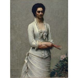 Eva Callimachi-Catargi, de dochter van de Roemeense gezant in Parijs, kijkt de beschouwer aan met een strakke, sombere blik. Haar over elkaar geslagen armen benadrukken haar enigszins afstandelijke houding, die kenmerkend is voor de vrouwenportretten van Fantin-Latour.