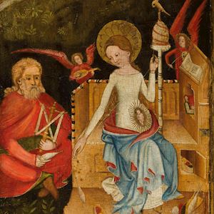 In de late middeleeuwen groeiden de steden enorm. Om de samenleving in deze overbevolkte steden in toom te houden waren christelijke normen en waarden van groot belang. Belangrijke idealen en normen werden ontleend aan de religieuze voorstellingen, en de Heilige Familie diende als modelgezin! Deze luiken van een drieluik van een onbekende schilder uit Tirol zijn hiervan een mooi voorbeeld. De Heilige Familie is hier, op hun vlucht naar Egypte, afgebeeld in een landschap, waar ze eerder meestal in een interieur gesitueerd waren. Kijk ook eens naar de liggende leeuwin op de voorgrond en de verschillende vogeltjes die boven hun hoofd in een struik zitten! Op het andere paneel zien we Jozef, nederig op de grond. Naast een spinnende Maria met het Christuskind in haar buik. Zij worden overstraald door een zegenende Christus met een kruis in zijn aureool en een wereldbol in zijn hand. We moeten ons namelijk, bij al deze huiselijke intimiteit, wel beseffen, dat het kindje in Maria’s buik de Verlosser van de mensheid is. Vandaar ook die musicerende engelen