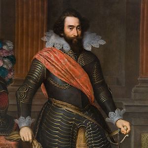 Dit levensgrote portret van Graaf Hendrik van den Bergh is nog niet zo lang geleden door Huis Bergh aangekocht. Het is geschilderd door de vooraanstaande schilder Otto van Veen in of omstreeks 1618. Bij Otto van Veen is onder andere de jonge Rubens in de leer geweest! Graaf Hendrik werd geboren in de roerige periode van de Tachtigjarige Oorlog. De Nederlanden waren toen in oorlog met Spanje. Hendriks ouders, Graaf Willem IV van den Bergh en Maria van Nassau, de zus van Willem van Oranje, hadden in deze oorlog de kant van Spanje gekozen. Graaf Hendrik bracht het in Spaanse dienst zelfs tot opperbevelhebber van het Spaanse leger in de Nederlanden! Graaf Hendrik van den Bergh trouwde twee keer en woonde afwisselend in Bergh, Ulft en in Elburg. Huis Bergh was zijn stamslot en hier heeft hij zijn testament gemaakt. Hij overleed in 1638 in Zutphen na een ongeval met een koets. In de grafkelder van de kerk, tegenover Huis Bergh, werd hij als laatste graaf Van den Bergh bijgezet.