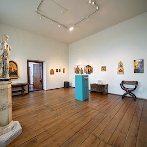 In deze kamer is de verzameling vroege Italiaanse schilderijen bijeengebracht. Dit is de groot¬ste particuliere verzameling van deze aard in Nederland. Bovendien is ook deze collectie weer heel divers. Vroege Italiaanse schilderijen zijn bijna altijd brokken of fragmenten van altaarstukken. Dat is ook wel te verklaren, want het leverde voor kunsthandelaren altijd meer geld op om altaarstukken op te splitsen en de afzonderlijke delen te verkopen. Zo is het ook gegaan met de meeste schilderijen die u hier ziet. Er wordt naar deze collectie regelmatig onderzoek gedaan want een van de dingen die kunsthistorici graag doen is om al die verschillende brokken met elkaar in verband te brengen. Om dat goed te kunnen doen is er vaak uitgebreid stilistisch onderzoek nodig. Met infraroodfoto’s kunnen eventuele ondertekeningen worden blootgelegd. En ook de houtstructuur wordt uitgebreid bestudeerd waarbij dan wordt gezocht naar zaaglijntjes die erop wijzen dat de panelen later afgezaagd zijn.