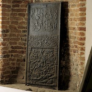 Dit is een bijzondere haardplaat. Het werd gegoten ter gelegenheid van het huwelijk van graaf Willem IV van den Bergh en gravin Maria van Nassau- Dillenburg, een zus van prins Willem van Oranje. De plaat is versiert met hun beider familiewapens. Zoals u kunt zien wordt deze haard nog regelmatig gebruikt. Deze haardplaat is dan ook een kopie. De echte is te zien in de toren en stamt uit 1562. Graaf Willem van den Bergh en gravin Maria kregen tijdens hun huwelijk zestien kinderen, acht zonen en acht dochters. Enkelen van hen zijn hier op het kasteel in portret te zien. Uit brieven met de handtekening van Willem van Oranje uit het archief van Huis Bergh kunnen we opmaken dat Graaf Willem tijdens zijn opvoeding aan het Habsburgse hof in Brussel al veel in contact kwam met een jeugdige prins Willem van Oranje. Tijdens de Tachtigjarige Oorlog, waarin de Nederlanden in oorlog waren met Spanje, kwamen de twee zwagers tegenover elkaar te staan toen graaf Willem samen met z’n zoons de Spaanse zijde koos. Niet lang daarna stierf hij op slot Ulft. Maria is daarna niet meer naar Huis Bergh teruggekeerd.