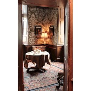 Deze kleine torenkamer noemen we het boudoir. Rond 1700 kreeg deze ruimte een nieuw plafond. Aan de stucrand ziet u dat ze de mode van die tijd hebben gevolgd. De schildering met toeschouwers die van bovenaf het vertrek in kijken, heeft een sterke perspectief-werking. Het 18de-eeuwse behangsel is gemaakt van stof van geitenhaar geplakt op een linnen ondergrond. De laatste kasteeleigenaar, Richard Cleve, liet het hier aan het begin van de 20e eeuw aanbrengen.