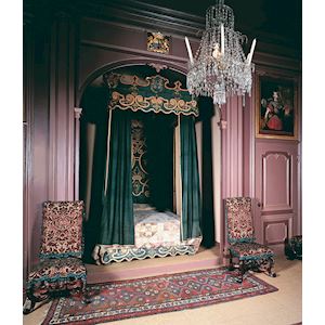 Welkom in de slaapkamer. De inrichting is 18e eeuws, alleen was de kamer toen niet purper geschilderd, maar geel. We pronkten vroeger graag met onze slaapkamer. Schitterend gestoffeerde ledikanten waren in die dagen de kostbaarste meubels van de hele inrichting! Daarom was het helemaal niet ongewoon om gasten in de slaapkamer te ontvangen. Deze slaapkamer was de eerste kamer die Anna Margaretha en haar man na hun huwelijk opnieuw lieten inrichten. Zo’n beddennis als u hier ziet, kwam in de 18de eeuw vaker voor Hun familiewapens prijken erboven. Het ledikant is 18de-eeuws, dat is goed te zien aan de versiering van opgenaaide banden.het is afkomstig van huis Mensinge in Drenthe. Het is dus niet het ledikant waarin Anna Margaretha- haar negen kinderen baarde.