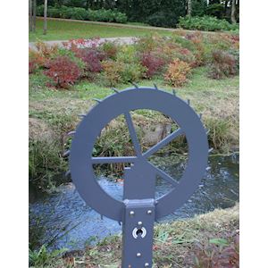 Deze stuw vormt de inlaat voor de slingervijver. De hoogte van zo’n stuw bepaalt hoeveel water er hier in de vijver staat Over het waterpeil was altijd onenigheid. Het reguleren van het waterpeil door middel van stuwen leverde ook vaak conflicten op.. Dat waterpeil was van groot belang voor ons molenaars, Het waterpeil werd daarom nauwkeurig vastgelegd. Bij conflicten moest vroeger de Kasteelheer tussenbeide komen. Later sprak de kantonrechter zich hierover uit. Ja, het leven van een molenaar draait om water. Daarom hoor je ons vaak zeggen `als er geen water is, drink ik water; als er water is, dan drink ik wijn’.