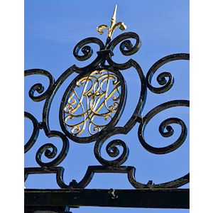 Sta voor u het park ingaat even stil bij deze mooie hekwerken. In het smeedwerk zijn initialen aangebracht van Anna Margaretha en haar man Frederik Johan en: Kijk maar: dan ziet u de V ende I van Van Isendoorn. En de R van V Renesse, … want Anna Mararetha was gravin Van Renesse. En de E hoort daar ook bij, die staat voor Elderen, vlakbij Luik, waar Anna Margaretha oorspronkelijk vandaan kwam. Maar natuurlijk mag de B van Blois niet ontbreken. De Van Isendoorns meenden namelijk af te stammen van de graven van Blois in Frankrijk en daar pronken ze graag mee. De laatste twee toevoegingen zijn vooral bedoeld om hun goede komaf te benadrukken. De initialen laten geen twijfel bestaan over wie het kasteel en zijn omgeving heeft verfraaid. Ook op andere plekken zijn familiewapens te zien, kijk maar eens op de gevels van de bouwhuizen, op de voortoren en op de schilden die de leeuwen vasthouden. En binnen in het kasteel zijn dezelfde wapens te vinden: boven de bednis in de slaapkamer, op het zilver… en zelfs in een borduurwerk….