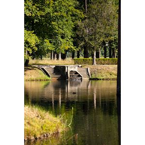 Rond 1762 begon Anna Margaretha aan het verbeteren van de waterlopen en de verfraaiing van het park. Deze dijk kwam er om het waterpeil te reguleren, maar vormde meteen een aangename ”promenade”. De cascade maakte het af: schitterend toch dat water dat klatert over een trap? De watertrap ligt precies op de middenas van de 18de eeuwse aanleg, waarin symmetrie als het belangrijkste principe gold. Kijk ook maar eens naar de waterpartijen rond het kasteel: ook daar is de symmetrie herkenbaar! Ze dateren uit de 17de eeuw, maar bleven in later tijd ongewijzigd voortbestaan.
