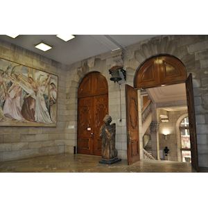 This hallway provides access to the Main Reading Room. Take a look at the works of art in the hallway. The monumental angel under the bell is a plaster cast for the Basilica of Koekelberg in Brussels by Harry Elstrøm. This Danish-Belgian artist also made the bronze commemorative plaque to the left of the Main Reading Room entrance, showing a portrait of Etienne Van Cauwenbergh. He was librarian of the University Library for as long as 42 years, from 1919 to 1961 which implies that he saw his library being destroyed and rebuilt twice. When Van Cauwenbergh left the library, there was a substantial collection of books and magazines. Unfortunately the university was split in two in 1968, after tension between the local French- and Dutch-speaking communities. As a consequence, in the 1970s the book collection of the library was divided between the two campuses KU Leuven and UCL in Louvain-La-Neuve. Nowadays there is a good understanding between the two universities. You see three paintings showing heroes of the Great War by the Brussels painter Albert Ciamberlani. They served as designs for mosaics of a palace in Brussels, located in Jubelpark. The bust next to Van Cauwenbergh represents Emile Francqui, a Brussels banker and benefactor of Leuven university. Francqui worked together closely with Herbert Hoover, both during the First World War and the period of rebuilding afterwards. Now also have a look at the doors leading into the Main Reading Room. You see a modern interpretation of the Sedes Sapientiae, the seat of wisdom, which is also the emblem of KU Leuven. This image of Congolese copper was designed by the Brussels artist Jacques Moeschal. In addition, you can see two inscriptions above the doors, one in Latin and one in Greek. The Latin sentence on the left translates as “Wisdom has built a home for itself” and the Greek text on the right as “Wisdom allows one to build a home”. This text was also above the entrance to the original library in the Naamsestraat.