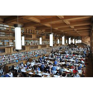 After the fire of 1940, this room and two adjacent rooms were remodeled by the Belgian architect Henry Lacoste. He managed to create a sense of unity through the double corridor and the frequent application of oak. The lion and the eagle at the bottom of the stairs to the corridor at the left side and the right side of the Reading Room, were made by Jacques Moeschal, the artist of the university’s emblem that you just saw in the hallway. The two animals keep the snake, as symbol of evil, in check. The snake follows the staircase upwards, to descend on the other side down to the ground. Be sure to take note of the corridors’ triangular balconies and look up at the panels on the balustrade to the left of the entrance door. As you can see, only two panels are worked; due to a lack of money the other panels were never completed. The Main Reading Room is 13 meters wide and 44 meters lo,g and contains about 40,000 books. This is only a fraction of the total collection: the other one and a half million volumes are in storage on the other side of the library. As you can see, the reading room is still in use. At the desk to the left, library clients come to pick up or return their books. Particularly during exam periods the reading room is packed with students. It is common for prominent visitors to drop by as well. Visitors from previous years include two American First Ladies, Barbara and Laura Bush, several American ambassadors, beloved author Umberto Eco and UN Secretary-General Ban Ki Moon.
