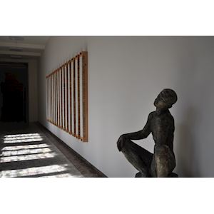 On the side to your right, you see an artwork by the Belgian artist Denmark from 1981. Entitled “Dead Archive XII”, it’s a collection of all written tests from one year of high school. In 2009 Denmark offered this artwork to the KU Leuven as a gift, to honor the then rector Marc Vervenne. Would you like to know more about this work? Read the text hanging across from the artwork. You may press B to pause this audio fragment in the meantime. By pressing B again the text will resume.