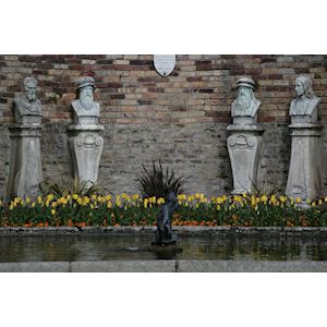 KITCHEN GARDEN Alex Welcome to Julia’s memorial. Here we tell you how a working kitchen garden became an ornamental garden. Anthony These walled gardens were built in the 1760s to support the new classical house. Alex As kitchen gardens, they would have supplied fruit and vegetables for the entire estate.AlexIn the 19th Century they became leisure gardens. There was even a tennis court. IRELAND’S VESUVIUS AnthonyBronze statues of ball throwers stand in the middle of both lawns. They are copies of ones found at Herculaneum in Italy. Alex Wasn’t that a Roman town buried when Vesuvius erupted in 79 AD? Sarah Indeed. You can see how the Sugarloaf Mountain in the background could pass for Vesuvius in the romantic Victorian imagination.Thanks to the distinctive profile of the Sugarloaf, local town Killiney is often compared to the Bay of Naples. JULIA’S MEMORIAL Anthony The memorial wall behind the pond honours Julia, the beloved widow of Mervyn Wingfield. Mervyn was my great great grandfather and the 7th Lord Powerscourt. Alex He was the visionary who completely transformed these gardens in the second half of the 19th century. Anthony This memorial features busts of the four great Italian masters of art; Michelangelo, Da Vinci, Raphael, and Cellini.This tribute to Julia was designed by her son in 1931. Sarah Dorothy Rowley would be delighted. 200 years after marrying into the Wingfields, her descendants were continuing her dream of recreating Italy in Wicklow.