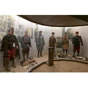 Durch die neue Art der Kriegsführung werden sich die Uniformen während des Krieges stark verändern. Die Ausrüstung, die diese Männer tragen, sieht aber noch aus wie die Ausrüstung zu Kriegsbeginn. Links steht ein belgischer Soldat in einer recht schlichten und einfachen Uniform. In der Mitte stehen zwei deutsche Militärs. Der Mann links ist ein gewöhnlicher Soldat in einer derben Wolljacke. Er steht neben seinem Vorgesetzten, einem deutschen Offizier. Seine Ausrüstung ist viel raffinierter und sein Mantel ist aus weicher Wolle gefertigt. Die Deutschen tragen auch die Pickelhaube, einen Helm aus Leder mit Kupferspitze. An dieser Spitze sollten Säbelhiebe abprallen. Die Briten hatten bis zum Ausbruch des Krieges nur Berufssoldaten. Dadurch eignet sich ihre Ausrüstung am besten für einen Grabenkrieg. Ihre Khaki-Uniformen entstanden in den Kriegen in Indien während des 19. Jahrhunderts. Die Briten tränkten ihre beigefarbenen Jacken in Kaffee, Tee oder Schlamm, um in der Umgebung weniger aufzufallen. Der zweite Soldat rechts ist ein Schotte. Am 10. November 1914 gelang es dem schottischen Black Watch-Regiment als einzigem Regiment, die Linie südlich von Zonnebeke zu halten.