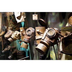 It is 1915 and the front is completely gridlocked. A classic mass attack is no longer effective. New weapons are needed to break the deadlock in the trench war. So behind the front lines, all parties involved in the battle work hard on technological inventions, that should win them the war. The First World War is also the first war in which troops use gas on a large scale. The Second Battle of Ypres starts with the very first poison gas attack. On April 22, 1915, the Germans open 6,000 canisters of chlorine gas. A yellowish green gas cloud slowly rolls over the allied positions and soldiers flee in a panic. But this success is unexpected and the Germans have to contend with poor provisioning and a shortage of reserve troops. The attack stalls after a few kilometres. Quickly after this first gas attack, soldiers are starting to protect themselves against the poisonous substance. A first form of protection is urinating onto a handkerchief, as the urine mostly stops the chlorine gas. Luckily, an adequate protection against gas is quickly being developed. The masks evolve as fast as the gases used in the battles. The best-known gas is mustard gas, which was used frequently for the first time around Ypres in 1917 and is therefore known as "yperite".