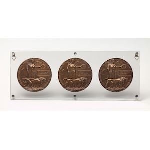 Les Australiens font également partie de l’Empire britannique, eux aussi luttent côte-à-côte avec les Britanniques. Avec les Néo-zélandais ils forment l’ANZAC, le Australian and New Zealand Army Corps. En France, ils participent à la Bataille de la Somme en 1916, puis en 1917, ils luttent dans la Bataille de Passendale. Ces trois plaques commémoratives circulaires en bronze, sont exposées exceptionnellement. Elles ont été remises à la famille australienne Seabrook. Les plaques commémorent la tragique disparition de trois frères d’une seule famille, morts pendant leur premier jour au front : Theo, George et William Seabrook. Notez que beaucoup de plaques commémoratives que vous voyez ici portent des noms identiques. Le cas de la famille Seabrook n’est pas isolé. Souvent des frères partent au front ensemble et y trouvent la mort côte-à-côte.