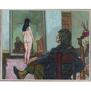 Auf diesem Gemälde von Arie Kater steht das weibliche Nacktmodell im Atelier des Malers. Im Vordergrund sitzt der Künstler, der von seinem Stuhl aus das Modell betrachtet. Im Hintergrund ist ein Spiegel zu sehen, in dem Sie das Spiegelbild des Künstlers entdecken können. Auf diese Art und Weise wird das Modell von zwei Seiten aus flankiert durch das betrachtende Auge des Künstlers. Die Malerei stellt so auf besondere Weise den Prozess von Betrachten und Betrachtet werden dar. Arie Kater malt und zeichnet Menschen und menschliche Beziehungen. Oft geht es um Individuen am Rande der Gesellschaft aber ebenso um sich liebende Paare und nackte Personen. Er stellt sie dar wie er sie sieht und aus seinem Gedächtnis. Ohne sie zu verschönern schafft Kater erbarmungslos ehrliche Bilder. Von einem beliebig gesetzten Klecks beginnt er eine Geschichte zu erzählen über die psychologische Verfassung seiner Figuren, ihre Motive, Dummheiten und Eigentümlichkeiten. Er macht das Unsichtbare sichtbar und spürbar. Seine Art und Weise zu arbeiten verstärkt das noch; er malt mit einem lockeren Pinselstrich und einer besinnlichen Farbpalette. Seine Kompositionen sind einleuchtend und streng und er schafft große Räumlichkeit durch einen leeren Hintergrund.