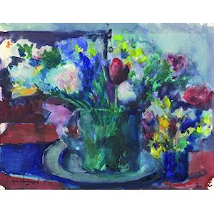 This watercolour shows a colourful still-life, Kees Verwey's speciality. With oil paints and watercolours, he painted numerous still-lifes of flowers, especially from his studio. This still-life was created by lavish layers and smudges of watercolours next to and over each other, here and there more transparent or even thicker. Everything to create a rich and dramatic effect. It shows that Kees Verwey used his continuous surprise of the tireless strength of daily reality as an inspiration for his work. He was inspired by his own surroundings and studio in Haarlem. His artwork is an exercise in being aware of what is going on around you. His quote “art is reflection” is not only about the intense way of observing, but is also a reference to his own life. Everything he had with him in his life: his family and origin, the rich legacy of the Dutch art tradition, his earlier mentors, not forgetting art from his own time, are all reflected in his work. With work that embraces almost all of the twentieth century, and the appealing dynamics in all his work, Kees Verwey is valued as the greatest Dutch artist of the last century.