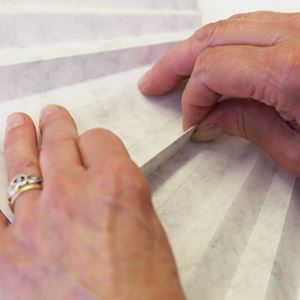 VOICE BThis section covers several topics including fan terminology, structure and assembly. A diagram on the upper shelf identifies the components of a folding fan which combines a pleated leaf and set of sticks. The terminology we use to describe the parts is by no means universally agreed and includes many French words which do not always translate satisfactorily. Monture, for example, is the term used to describe the sticks or frame supporting the pleated leaf. VOICE AOn the same shelf, you can see several pleated cardboard moulds. Like the craft of the dress pattern cutter, the production of the moulds is a complicated equation incorporating mathematics and geometry. An alternative pleating method is recorded in detail within the set of illustrations displayed on the back panel of this section.