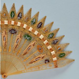 Prior to the advent of plastics, the natural world provided all the materials used to make fans. By the close of the Seventeenth Century a global trade in raw materials such as elephant tusks and turtle shells had developed. Whilst processing methods remained mostly unchanged, with the passing of time the techniques used to work and decorate fan materials were gradually perfected.VOICE AThe displays in this section juxtapose raw materials with finished articles and give a sense of the transformative process of fan making. Look first at section 6 which shows a range of fans crafted in mother of pearl and horn with examples of both materials in their unprocessed state.