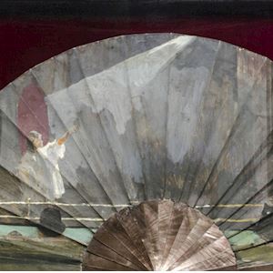 The works displayed between the two windows are by fine artists, as opposed to artists who have made fan painting their specialism. To explain the involvement of fine artists within the story of fan-painting, we should look Eastward, toward Japan. Following a sustained period of isolation, Japan was forcibly reopened in the 1850s. Suddenly Europe was flooded with Japanese prints, sculpture, lacquerware and, of course, fans. Inspired by Japanese aesthetics, several prominent artists including Degas, Toulouse Lautrec and Gauguin began experimenting with fan painting, recognising in this unique format, a creative challenge which required a different approach quite unlike that of the rectangular canvases which they usually painted. The impressionists conjured compositions unlike any seen before on fans with subjects appearing to float freely, moving beyond the boundaries of the arc in a manner reminiscent of Japanese fan painting. In the 20th century, artists continued to engage, albeit to a lesser extent, with the discipline of fan painting. In Britain, George Sheringham and Charles Condor produced designs for fans and other key figures in modern art – Miró, Dali and Kokoschka – painted fans during their lifetime.