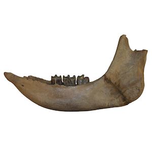 Jestatten, Wollnashorn mein Name. Da wo Se heut stehen, bin ick in der letzten Eiszeit rumjeloofen. Vor sich sehn Se meene Kieferknochen. Beeindruckend, wa? Mit dem Jebiss fress ick täglich über 100 Kilo Gras. Dit is janz schöner Stress. Denn da leben noch andere Tiere. Mammuts, Rentiere…. Dit wird mitunter eng in da Steppe. Hey, ick fresse hier?! Sucht euch jefälligst nen andren Platz! Die Kälte macht ma ja nüscht aus. Unter meinem glatten Deckhaar hab ick nen dichten Wollpelz. Und groß bin ick ooch: 2 Meter hoch, dreieinhalb Meter lang. Wie meen Name verrät mit langem Horn uff da Nase, sieht aus wie ´n Brett. Dit brauch ick ooch: Damit schieb ick Eis und Schnee beiseite. Darunter find ick meist noch essbares Gras. Nur hab ick jetzt immer solche Zahnschmerzen... So, jenug jequatscht: ick mach ma jetzt uff´n Weg nach Spandau. Dit Gras soll dort saftiger sein… Dieses Wollnashorn hätte einen Tierarzt gebrauchen können. Es hatte Wackelzähne, ein Zeichen von Parodontitis. Das zeigen die großen Spalten zwischen Zahn und Kieferknochen. Deswegen ist es möglicherweise später verhungert. Wollnashörner lebten im Berliner Raum in der Eiszeit zwischen 100.000 und 30.000 Jahren vor heute.