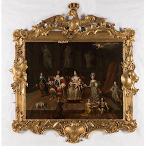 Dieses Gemälde verrät Ihnen etwas über meine Familie. Ich bin Dorothea Sophie von Schleswig-Holstein-Sonderburg-Glücksburg, die zweite Frau von Wilhelm dem Ersten von Brandenburg. Hier throne ich neben meinem Mann. Meine Neider sehen in mir nur eine Intrigantin. Dabei verdankt Berlin mir viel Gutes, wie die Dorotheenstadt. Sieben Kinder habe ich dem Kurfürsten geboren. Aber der Thronfolger blieb Friedrich, sein Sohn aus erster Ehe. Er fehlt auf diesem Gemälde. Habe ich dafür gesorgt? Böse Zungen behaupten das. Denn da steht mein Ältester, Prinz Philipp, neben dem Kurfürsten in Rüstung. Meine beiden Jüngeren halten den Kurhut, das Symbol der Herrscherwürde. Meine Neider sagen ich wollte hier den Anspruch auf den Thron für meine Kinder zeigen. Wir wissen nicht, ob Dorothea das Gemälde beauftragte. Aber überliefert ist der Streit über die Nachfolge des Kurfürsten. Nach seinem Tod wollte er Brandenburg-Preußen unter all seinen Söhnen aufteilen. Aber sein Testament hatte keinen Bestand: Sein Erbe ging an seinen Erstgeborenen Friedrich. Dieser mußte jedoch die anderen Söhne ausbezahlen. Es gelang ihm erst nach 13 Jahren. Als Friedrich der Erste krönte er sich dann zum ersten König in Preußen.
