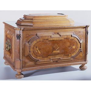 Willkommen im Zunftsaal des Märkischen Museums. Wer kennt heute noch den Begriff Zunft? Das war früher ein wichtiger Zusammenschluss von Handwerkern, wie etwa Maler oder Tischler, Schlosser oder Bäcker. Zünfte hatten vom Mittelalter bis ins 19. Jahrhundert großen wirtschaftlichen Einfluss. Die Zünfte setzten die Löhne fest. Sie sorgten dafür, dass es nicht zu viel Konkurrenz gab und kontrollierten die Qualität der Arbeit. Und sie halfen Handwerkern in Notlagen. Vor sich sehen Sie eine Zunftlade der Berliner Tischler aus dem Jahr 1745. Sie ist aufwändig gearbeitet: mit Rückenlehne, Messinggriffen und Kugelfüßen. An der Seite abgebildet sind die Werkzeuge der Tischler: darunter Hobel, Zirkel und Maßstab. In der Lade aufbewahrt wurden wichtige Dokumente. Aber auch sogenannte Willkommenspokale, zu sehen hier auf dem langen Tisch. Geöffnet war die Truhe früher nur während der Sitzungen der Zunft. Gebaut wurde dieser Saal als Denkmal für das Berliner Handwerk. Entworfen hat ihn Ludwig Hoffmann. Der Saal entstand, als die Zünfte bereits nicht mehr existierten. Denn nach Einführung der Gewerbefreiheit 1810 verloren sie zunehmend an Bedeutung. In dieser Zeit wurden dem Museum viele Stücke aus der Zunftvergangenheit geschenkt.