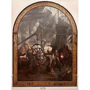 Sehen Sie, wie meine Arbeiter das glühende Metall in Form hämmern? Hier ensteht eine unserer Lokomotiven, eine Borsig-Lok. Ich darf mich vorstellen, Albert Borsig mein Name. Mein Vater August gründete 1837 unser Maschinenbau-Unternehmen. Heute im Jahr 1868 liefert die Firma Borsig Lokomotiven in die ganze Welt. Den Erfolg unserer Familie wollte ich in Gemälden würdigen. Beauftragt habe ich dafür den Tiermaler Paul Meyerheim. In Bildern sollte er die Lebensgeschichte einer Lokomotive erzählen. Vom Abbau der Rohstoffe über die Herstellung bis zum Transport der fertigen Lok. Denn das ist die Grundlage unseres Unternehmens. Nun gut, die Gemälde zeigen eine geschönte Wirklichkeit. Aber die Bilder sollen vor allem unsere Loggia in Moabit schmücken. Aushalten müssen sie dort das wechselnde Wetter. Gemalt sind sie daher in Öl auf Kupfer statt auf einer Leinwand. [Neutraler Erzähler]: Wie AEG oder Siemens hat auch die Firma Borsig ihre Wurzeln in Berlin zur Zeit der Industrialisierung. Produkte wurden nun verstärkt mit Maschinen gefertigt und in großen Mengen hergestellt. Die Industrialisierung veränderte das Leben der Menschen spürbar und langfristig.