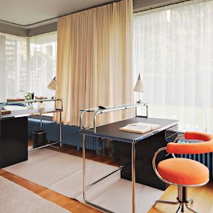 Huis Sonneveld werd opgeleverd in 1933 en wat u nu ziet is een zorgvuldige reconstructie van de situatie toen, inclusief de stofferingen, meubels en inrichting. Het is een van de best bewaarde voorbeelden van het Nieuwe Bouwen. Architect was Leen van der Vlugt, van bureau Brinkman & Van der Vlugt. Dat bureau had ook de Van Nelle fabriek ontworpen, de fabriek waarvan de opdrachtgever van dit huis, de heer Sonneveld, een van de directeuren was. Van der Vlugt tekende niet alleen het gebouw, hij was ook verantwoordelijk voor het interieur en de inrichting. Zo creëerde hij een hypermodern, luxueus woonhuis, precies op maat gemaakt voor de bewoners. De kamer valt op door het vele licht en de nabijheid van de tuin: drie van de vier wanden bestaan uit grote ramen. Deze ‘studio’ was bedoeld voor de twee dochters van de familie Sonneveld. De oudste, Magda – bijgenaamd Puck – was 19 jaar toen de familie in 1933 het huis betrok. Gesine – meestal kortweg Gé genoemd – was zeven jaar jonger. In de studio zaten Puck en Gé te lezen, luisterden ze naar muziek en ontvingen hun vriendinnen. De studio is de enige kamer in het huis met parket op de vloer. Waarschijnlijk is hiervoor gekozen om te kunnen dansen bij feestjes. De twee bureaus, de tafel en de stoelen zijn van Gispen, de Rotterdamse firma die bijna alle stalen buismeubels in het huis leverde. De bank tegen de wand is door de architect zelf ontworpen. Het is een multifunctioneel meubel dat behalve als bank, ook dient als boekenplank, kast, en geluidsinstallatie. Rechts zit een luidspreker, onder het deksel stond een grammofoon en naast de zitting van de bank is het bedieningspaneeltje waarmee volume en radiozenders gekozen konden worden. Deze geluidsinstallatie is een van de geavanceerde technische snufjes van het huis. Ze staat in verbinding met andere kamers, waar steeds een luidspreker en een knop is. Zo konden de bewoners overal in huis naar de muziek luisteren die in deze kamer was uitgekozen.