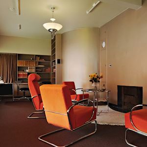 In de werkkamer, annex bibliotheek staat het bureau van de heer des huizes, een vaste boekenkast en bij de openhaard een zitje. Bijzonder is de halfronde wand, die extra opvalt door de metallic verf. Achter deze wand, gaat het trappenhuis schuil. De meubels in deze kamer zijn allemaal van Gispen, zoals de stoelen met hun oranjerode bekleding: echte eye-catchers. Er zijn twee herenstoelen met een hoge rugleuning en hoofdsteun, terwijl de twee damesstoelen een lagere rugleuning hebben, zodat het kapsel of een hoed niet in de verdrukking kwam. In de wand rond de openhaard kunt u een aantal hypermoderne technische voorzieningen ontdekken. Er is een klok die aangesloten is op het elektrische net. In de meeste kamers is zo’n uurwerk, iets wat echt uitzonderlijk was in die tijd. Links van de haard is een verticale strook van kastjes, met bovenin een luidspreker van het centrale geluidssysteem. Maar het onderste deurtje verbergt het mooiste snufje: een liftje waarmee hout voor de openhaard vanuit de kelder naar boven gehaald kon worden. Een noviteit was ook de verlichting in bibliotheek en zitkamer, met maar liefst 22 smalle buislampen aan het plafond. Ze doen denken aan tl-buizen, maar het zijn Philinea-lampen, die een hele lange gloeidraad hebben en veel warmer licht uitstralen. Naast deze lichtbatterij zijn er lampen van Gispen, zoals de twee grote hanglampen: de Giso nr. 63, met een opaalwitte, glazen schaal.