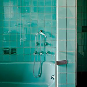Deze ruimte vormt een spectaculair hoogtepunt van de rondleiding. De badkamer van mevrouw en meneer Sonneveld was in de jaren ’30 het toppunt van modernisme. Let u wel op: dit originele toilet uit 1933 is buiten gebruik! In een tijd dat veel huizen nog geen douche hadden was deze badkamer, met twee wastafels, een douchecabine en een bad (en ook weer een verwarmd handdoekenrek) uitzonderlijk. Meneer Sonneveld had het idee voor de massage douche in Amerika opgedaan. Daar kwam hij al vanaf zijn 24ste en logeerde hij in luxe hotels. Sonneveld liet dan ook de grote sproeikop en de 9 kleinere die in de tegelwanden zijn verwerkt speciaal voor zijn huis in Rotterdam overkomen uit de States. Liesbeth Quartero, een jeugdvriendinnetje van Gé - de jongste dochter - herinnert zich nog steeds hoe zij met haar vriendinnetje stiekem ging douchen als meneer en mevrouw even niet thuis waren. Dat moet een hele belevenis geweest zijn in die douchecabine met maar liefst tien douchekoppen. Nadat de vriendinnetjes gedouched hadden poetsten ze alles zorgvuldig droog en schoon, opdat moeder niets zou merken. Die hield de glans van de verchroomde glasdeur nauwkeurig in de gaten.