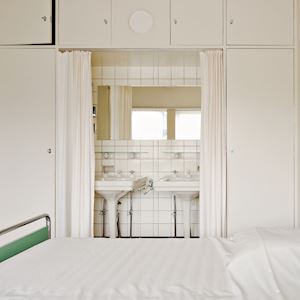 Deze slaapkamer was bestemd voor de logees van de familie Sonneveld. Waarschijnlijk zijn dat er niet zo veel geweest. Als er gasten kwamen, waren dat meestal zakenrelaties van meneer en omdat het Parkhotel – ook toen al – om de hoek lag, logeerden belangrijke gasten daar. Een enkele keer zal er familie geslapen hebben in deze kamer, maar het waren vooral de vriendinnen van de meisjes die kwamen logeren. Toch was de kamer bij hen ook niet echt populair: ze sleepten liever een matras naar de slaapkamer van Puck of Gé en sliepen dan op de grond – wel zo gezellig! De kamer heeft geen eigen badkamer. Gasten gebruikten de badkamer van de dochters aan de andere kant van de gang. De kamer heeft wel een dubbele wastafel en ook verder heeft de kamer de luxe van alle andere slaapkamers, inclusief telefoon, klok en geluidsinstallatie. Op de grond ligt grijs kurklinoleum. Linoleum hoorde bij het hypermoderne huis en werd door alle architecten indertijd aanbevolen omdat het waterdicht is, isolerend, geluiddempend, duurzaam en bovendien mot-, stof- en bacterievrij. Ideaal voor een huishouden waar reinheid en netheid gepredikt werden.