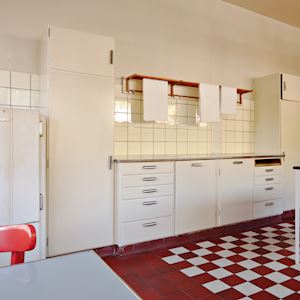 De keuken was het domein van de diensbodes. Hier brachten zij het grootste deel van hun tijd door, met koken, afwassen en ander huishoudelijk werk. Na gedane arbeid aten ze er zelf, aan het tafeltje bij het raam, vanwaar ze een prachtig uitzicht hadden over de stad. Deze vrolijk geblokte overgordijnen werden geleverd door de firma Metz & Co in Amsterdam. Kijkend door het raam, naar beneden, is het garagepad te zien. De halve cirkel is nodig om de auto’s in en uit de garage te rijden. Het gezin had twee auto’s; meneer had een chauffeur die hem van en naar De Van Nelle fabriek reed. Een rij taxus boompjes langs het garagepad scheidde het terrein van het personeel van de tuin van de familie. De keuken is van allerlei moderne gemakken voorzien. De elektrische koffiemolen boven het aanrecht, de vuilstortkoker rechts van de deur, de telefoon om te horen wie er beneden bij de dienstingang stond. De goederen die werden afgeleverd konden dan met de elektrische lift worden getransporteerd, naar boven, naar de keuken, of naar beneden, naar de kelder. Een zoemend geluid gaf aan dat een van de meisjes nodig was. Ook de lampjes bij de deur dienden om het personeel op te roepen. Eigenlijk ging alleen het koken zelf nog ‘ouderwets’. Er werd gekookt op gas en niet elektrisch wat toen in veel adviesboeken werd aangeraden. Mevrouw Sonneveld was praktisch ingesteld en koos voor het goedkopere en snellere gas. De Bruynzeelkasten langs de wand tegenover het fornuis horen oorspronkelijk niet in het huis maar zijn van later datum. Ze zijn ontworpen door Piet Zwart in de jaren 30 en zouden een standaard onderdeel worden van veel Hollandse keukens. Mevrouw Sonneveld bestierde het huishouden met ferme hand. Ze zette zelf thee en braadde het vlees aan, verder hield ze de meisjes aan het werk en controleerde ze. Er heerste een cultus van netheid in het huis. Alles werd na gebruik direct weer opgeruimd, en het chroom moest blinken. Een van de dienstbodes, mevrouw Jeanne Schreuder, die van 1934 tot 1936 diende bij de familie, heeft ondanks de gemakken en de luxe van het huis, niet zulke prettige herinnering aan deze tijd: ze vond haar bazin precies en streng.