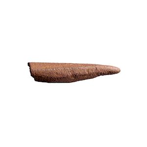 Heb jij veel fantasie? In deze vitrine ligt iets wat lijkt op een… lippenstift. Vind je het? Bij nummer 3. Een langwerpig dingetje met een ronde punt. Onze ‘lippenstift’ is van rode oker. Da’s een kleurstof. Voor op het lichaam, misschien. Ik denk dan altijd aan de rode lippenstift van mijn vrouw. Of aan henna, om je haar te kleuren. Aan tattoos ook… Ja, mensen gebruiken in onze tijd best wel veel kleurstoffen om hun lichaam te versieren. Waarschijnlijk is dat ook in de prehistorie al zo! Rode oker is dan iets heel bijzonders. Misschien denken mensen dat lichaamsversieringen in rode oker hun kracht geven als ze op jacht gaan. Of dat ze geluk brengen… Zeg, heb je al gehoord dat ik dikwijls ‘misschien’ zeg, of ‘waarschijnlijk’? Dat moet wel, want het is héél moeilijk om zeker te weten wat mensen vroeger dachten. Waarin ze geloofden. Wat ze voelden… In de steentijd gebruiken mensen rode oker voor nog andere dingen, dat weten we wél zeker. Ze maken een plakkerig papje van oker en hars van een boom. Daarmee zetten ze stenen pijlpuntjes vast in een houten pijl. Maar dat laat ik jou zelf ontdekken, in het filmpje voor je. Kijk maar!