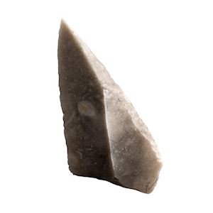 We staan op het punt om de eerste zaal te verlaten. Wat je in deze vitrine ziet, is 8000 tot 6000 jaar oud. Nog altijd is vuursteen dan hét gesteente waar mensen werktuigen en wapens mee maken. Maar zoals je ziet: de scherpe pijlspitsen en de schrabbers zijn nu erg klein. Dát houdt verband met de leefomgeving… Het klimaat warmt in deze periode al een tijd op in onze streken. In die warme periode leven wij nog altijd. Er ontstaat een landschap met beken en meren, en vervolgens met dichte loofbossen. Hierdoor tref je ook andere dieren aan: reeën, watervogels… Maar wat is het verband met het gebruik van onze kleine spitsen voor de pijlen? Zeker weten we het niet, maar misschien heeft het met die kleinere dieren te maken. Ofwel slinkt na duizenden jaren van intensief gebruik de voorraad vuursteen in de natuur en moet men zuiniger zijn? Of zijn de vuursteenknollen minder zichtbaar, door de begroeiing? Ook dat kan. In elk geval: door de overvloed aan dieren en planten wordt het leven makkelijker. De bevolking groeit aan, mensen hoeven geen grote afstanden meer af te leggen om voedsel te vinden… Vanaf deze periode zullen er in deze regio altijd mensen verblijven! Dat was tot nu niet het geval. Maar er zijn ook drastische veranderingen op komst in hoe mensen leven. Die ontdekken we op de eerste verdieping.