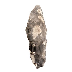 Links in de vitrine zie je houwelen. Rond 4000 voor Christus hakt men daar in mergellagen mijnschachten mee. Op zoek naar vuursteen. Om er bijlen van te maken. In de vitrine rechts ligt zo’n grote bijl. Daarmee rooien mensen in een hoog tempo bossen, want er is meer akkergrond nodig voor de voedselbevoorrading van de aangroeiende bevolking. Vanaf zowat 4300 voor Christus wordt in onze streken geleidelijk aan iedereen landbouwer. Rond 3000 is dat proces voltooid. Terug naar onze vuursteen. Bij de Maas vond men sinds duizenden jaren aan de oppervlakte kwaliteitsvolle vuursteen. Rond 4000 voor Christus raken die voorraden uitgeput. Maar mensen weten dan al dat je ook ónder de grond vuursteen vindt. Zo ontstaat er mijnbouw. Met houwelen als deze, maar ook met geweien, worden in de kalksteen schachten gehakt. Op zoek naar vuursteenknollen. Tot zeven en zelfs twaalf meter diep. Zo ontstaan in onze streken mijngebieden. In Nederlands-Limburg hebben archeologen op een terrein van acht hectare meer dan 75 schachten onderzocht. Van de naar schatting… 2000 die ze er aantroffen, uit een periode van 1500 jaar. Nog één cijfer: in de onderzochte schachten vond men bijna 15.000 botte houwelen. De vuursteen die mensen hier bovenhalen, is bijzonder populair, ook in buurgebieden. Ter plaatse maken ze er ruwe bijlen en lange klingen van, half afgewerkte producten. We vinden die terug tot bij Frankfurt, zowat driehonderd kilometer verderop. Daar werkt men ze af.