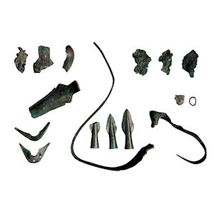 800 voor Christus. Mensen worden dan al sinds enkele eeuwen op een brandstapel gecremeerd en begraven op een urnenveld. De meeste graven bevatten wat we hier zien: een handgevormde urne, een eenvoudig bekertje, een bronzen armband soms. Voorwerpen die ter plaatse zijn gemaakt. Deze graven zijn de laatste rustplaatsen van gewone mensen, veelal boeren. Rechts zie je objecten die uit één elitegraf komen. Een graf van drie mensen, twee mannen en een vrouw. Ze waren tussen 25 en 35 jaar jong. Hun graf bevatte drie lanspunten in brons, het bronzen beslag van zeker twee zwaardscheden én drie fragmentaire bronzen zwaarden, waaronder het gebogen exemplaar dat we bij ons derde knooppunt apart belichten en dat hier door een replica is vervangen. Dat vrouwen en mannen uit de elite samen worden begraven, is ongewoon. Zijn deze drie samen overleden, na een gevecht? Wapens in een graf, dat was iets voor mensen uit de elite, een beperkte groep. Die is ontstaan door de handel in ijzer en zout.