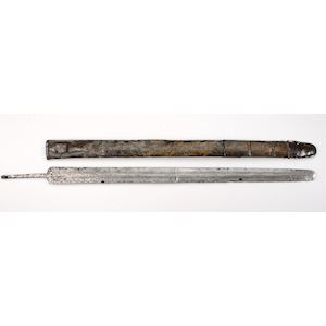 Ambiorix, ken je hem? De koning van de Eburonen? Misschien was dit zijn zwaard. Het zwaard van een koning! Eburonen is de naam van de mensen die in onze streken wonen als de Romeinen hier met hun leger binnenvallen, rond het jaar 50 voor Christus. De Romeinen komen uit Rome, ah ja, ze willen hun Rijk steeds groter maken! Koning Ambiorix en zijn Eburonen vechten keihard tegen de Romeinse soldaten. Misschien dus met dit zwaard, een prachtstuk… Zo’n lang slagzwaard van bijna één meter, dat is ideaal om vanaf je paard een vijand hard te raken. Maar veel Eburonen sterven in het gevecht en Ambiorix verliest de oorlog tegen de Romeinen. Vanaf dan zijn onze streken een deel van het grote Romeinse Rijk. Is Ambiorix gevlucht? Heeft hij z’n ijzeren zwaard geschonken – offeren noemen we dat - aan de goden, door het in een moeras te werpen? Want daar heeft een graafmachine het in 1980 opgegraven. Toevallig… Ach, je hoeft mij niet te geloven met m’n verhaal over Ambiorix-in-het-moeras, maar dit zwaard komt wel heel zeker uit zijn tijd. Weet jij tegen welke Romeinse generaal Ambiorix heeft gevochten? A = Augustus B = Asterix C = Caesar Julius Caesar, C! Caesar heeft daarover een boek geschreven, in het Latijn: Oorlog in Gallië, heet het. Gallië, dat is nu Frankrijk en België samen. Ik heb het natuurlijk gelezen. Spannend, hoor! Het is voor het eerst dat iemand zoveel over onze streken schrijft. Zo schrijft Caesar dat de mensen hier geruite broeken droegen. Oh ja, vergeet straks niet om even naar Ambiorix te kijken. Je komt hem tegen net voor je deze zaal verlaat. Je ziet hem al staan. Zo denken wij, archeologen, dat hij eruitzag! Met een geruite broek, dus.