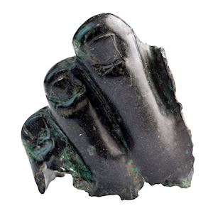 Hier doen we een beroep op je verbeelding. Je ziet de drie middeltenen van een linkervoet in brons. Probeer je even voor te stellen hoe groot het beeld moet zijn geweest. In elk geval: monumentaal. Stel je nu een plein voor in het centrum van de stad. We hebben het dan over het forum, dat is het politieke, economische en religieuze hart van elke stad in het Romeinse Rijk. Dat forum en ook de openbare gebouwen eromheen staan op den duur vol met beelden in brons en van steen: van keizers, goden, belangrijke burgers, befaamde atleten… Hoe Romeins Tongeren en zijn forum er hebben uitgezien weten we niet – we weten nog niet waar het forum precies ligt – maar van andere steden is bekend dat er grote openbare gebouwen omheen staan én dat de elite er alles aan doet om de stad te verfraaien. Zie je hier links bijvoorbeeld het druk versierde kapiteel in steen? Dat is een getuige van die opsmukzucht. Hoe komt het eigenlijk dat er al bij al maar weinig fragmenten van gebouwen en beelden zijn bewaard? Omdat de steen en het brons al in de Romeinse tijd zelf, en ook later nog, zijn hergebruikt: steen werd tot kalk gebrand om daar mortel en beton mee te maken, metaal zoals brons werd gesmolten, En soms vergat men bij dat smelten enkele bronzen tenen…