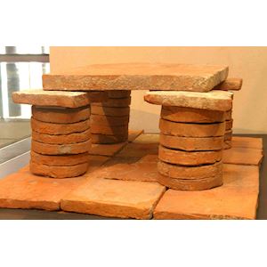 Waar zich nu dit museum en ook de basiliek bevinden, staan in Romeins Tongeren chique woningen. De lokale elite pakt daarin graag uit met geïmporteerde luxe en rijkdom. Zulke elitewoningen beschikken bijvoorbeeld over vloerverwarming. Hoe dat werkt, tonen we hier. De vloer rust op pijlertjes van ronde tegels in terracotta. Vanuit een stookplaats circuleert de warme lucht naar de holle ruimte onder de vloer en via buizen in de wanden van het verwarmde vertrek. Ook in je interieur pak je uit met luxe, bijvoorbeeld met je meubels en met andere dure goederen. Het meest prestigieus is een vakkundig geplaatste mozaïekvloer. Vooral als blikvanger in je ontvangstruimtes is zo’n pronkstuk erg gewild. Je ziet hier fragmenten van Tongerens best bewaarde mozaïekvloer. Ooit was hij 19 meter lang en 3 meter breed! Hij lag in een gaanderij van een stadswoning. Kijk ook naar de muurschildering met haar witte ondergrond! In het midden prijkt een bassin, links en rechts twee pauwen op een guirlande van groene blaadjes en rode bessen. Twee sokkels met de buste van een godheid scheiden de panelen. Al die motieven kennen we ook van wandschilderingen in, bijvoorbeeld, Pompeii. Dat heeft ons geholpen bij het maken van deze reconstructie. De muurschilderingen moeten de indruk geven dat je in een weelderige tuin bent, ook al sta je in werkelijkheid op een binnenkoertje. We hebben een tip voor je: onder de basiliek kun je de archeologische site bezoeken. Je maakt er kennis met sporen van luxewoningen uit de Romeinse tijd. De muurschildering met de pauwen komt uit een van die woningen.