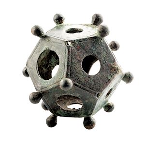 Laten we dit mysterieuze object eerst even van nabij bekijken. Je ziet een figuur die is opgebouwd uit twaalf vijfhoeken. Hij is hol en van brons. Aan de twintig hoeken is elke keer een bolletje vastgehecht en de twaalf vlakken hebben allemaal een ronde opening. Hun grootte verschilt. Een ’dodecaëder’, zo heet het voorwerp. We kennen op dit moment meer dan honderd van die dodecaëders, meestal uit het noordwesten van het Romeinse Rijk. Geen twee exemplaren zijn dezelfde en we vinden ze op plekken waar ooit graven, badhuizen, heiligdommen, legerkampen... stonden Dit exemplaar is aangetroffen in Romeins Tongeren, vlak bij het grafveld van Atuatuca Tungrorum, net buiten de stadsmuur. Waar heeft dit voorwerp voor gediend? We weten het niet zeker en oude teksten erover hebben we niet. Dit is waar men al aan heeft gedacht: een knots, een stuk speelgoed, een dobbelsteen, een kaarsenhouder, een instrument om de diameter van buizen te meten, een sierstuk… Maar: op een dobbelsteen met twaalf vlakken uit Genève zijn de twaalf tekens van de dierenriem voorgesteld. En we kennen ook een dodecaëder die bovenop een staf was gemonteerd, als knop van een scepter. Waarschijnlijk werden dodecaëders gebruikt in een sfeer van magie en astrologie, en was het ook een soort machtssymbool…