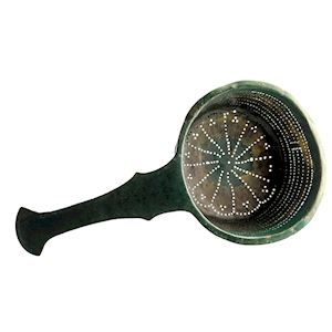 Wijn is dé drank van de Romeinen. En wanneer ook onze streken tot het imperium gaan behoren, raakt ook hier wijn verspreid en wordt het een dagelijks consumptieproduct. Dat is opnieuw een bewijs van wat we romanisering noemen, het overnemen van Romeinse gebruiken en tradities. Deze wijnzeef is gevonden in het huidige Riemst, op het toenmalige platteland. Veel mensen drinken wijn waarvoor de druiven in Gallië zelf worden verbouwd, maar de elite laat ook kwaliteitswijnen importeren uit Griekenland en Italië. Deze mensen verblijven een deel van hun tijd in hun stadswoning, en een ander deel in hun plattelandsvilla. De zeef brengt ons bij de manier waarop mensen in de oudheid wijn drinken: aangelengd met meestal warm water en op smaak gebracht met diverse ingrediënten: hars, honing, zeewater, allerlei kruiden, bloemblaadjes… Met een scheplepel schep je de wijn uit een mengvat en je filtert hem door de wijn door de zeef te gieten, in drinkschalen of -bekers. Het bezinksel en de restanten van hars en kruiden blijven dan in de zeef achter. Vermoedelijk wordt zo’n zeef ook bij de bereiding van voedsel gebruikt. Je ziet links van de wijnzeef nóg een prachtig bewijs van de romanisering van het platteland: een bronzen badflesje in de vorm van een buste van een Afrikaans type. Dat is óók gevonden in Riemst. Zo’n flesje was gevuld met olie. Het hoort bij de Romeinse badcultuur en de luxe die daar in een plattelandsvilla bij past. Waarschijnlijk stond het in een badvertrek van zo’n villa en belandde het later in een graf, als grafgift.