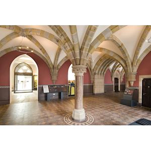 Welcome to The McManus: Dundee’s Art Gallery and Museum. This audio tour will last approximately one hour, depending on how much exploring you’d like to do along the way. To start the commentary at any audio tour stop, point the player at an activation point, holding it no more than one foot away, like a remote control. You don’t have to press any buttons. The commentary will start automatically after the tone. Your Podcatcher player has three buttons. Use the button on the left to turn the volume down, and the button on the right to turn the volume up. Use the middle button to pause the commentary, and to restart it. At stops where you’re offered supplementary content, the buttons work as options A, B and C. Before we start the tour…here’s some background about The McManus. As you’ll see, the architecture here is impressive. The building, which opened in 1867, was designed by Sir George Gilbert Scott. You might be familiar with other works by this famous architect, including London’s Albert Memorial, St. Pancras hotel and The University of Glasgow’s Gilbert Scott building. The McManus was originally designed as a memorial to Queen Victoria’s husband, Prince Albert, who had died in 1861. When the building opened in 1867, it was known as the ‘Albert Institute’. You’re now standing in the impressive Gothic Hall. Gilbert Scott was inspired by his passion for medieval architecture and you’ll see many elements that are typical of his mastery of the High Victorian Gothic Style. The Albert Institute was built in three stages, A public library and Great Hall An extension, to create the original Art Gallery and Museum And the final stage, which added The Victoria Galleries in 1889. In 1978, the Library was moved to new premises in the nearby Wellgate, and the museum interiors were modernized. In May, 1984, the building was renamed in honour of the late Lord Provost Maurice McManus. The McManus and its external streetscape were refurbished between 2005 and 2010.
