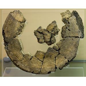 Dundee Law is a key landmark and is a part of Dundee’s distinctive skyline. The word Law simply means Hill. It rises to a height of 174 metres, providing a spectacular panoramic view over Dundee, the Sidlaw Hills and beyond. It’s a site that tells us much about the history of this area. We’ll take a look at the objects in this case, which contains materials found on the Law. During the Bronze Age, 4,000 years ago, the Law may have had ritualistic significance. Accounts from the 19th Century tell us that many small stone-built graves containing human bones were found, near the summit. Have a look at the graphic panel in the left hand case. During the Iron Age, 2,000 years later, there was a timber-laced hill fort –a stone wall braced with timber. The fort was destroyed by a fire hot enough to melt stone - look at object number 6 to see what this looks like. We don’t have much evidence to prove that this was a permanent settlement, though we do know that metalworking took place here. Look at object number 5, the samples of vitrified stone and slag found on the Law. Slag is the residue from smelting iron. Now, look at the stone lamp, object number 2. This was discovered during construction of the War Memorial, between 1923 and 1925. The lamp is Romano British, and dates from approximately 1,900 years ago. Additional pottery was discovered and it’s believed that pottery may have been used by native people as diplomatic gifts. The Law was purchased as a public park in 1878. Today, it’s an area for recreation, and also includes the impressive Dundee War memorial. When you’re ready, please turn to your right and look up at the large animal display.