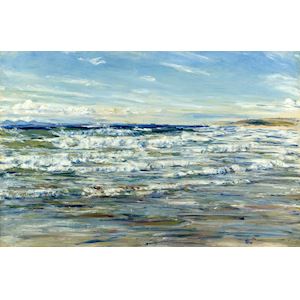 This painting, titled And All the Choral Waters Sang, was completed in 1902 by the artist William McTaggart. McTaggart is known for his coastal paintings, which often include children. This late work is unusual in that it contains no figures. Imagine seeing McTaggart painting this outdoors, on the beach at Machrihanish. It’s a three-mile stretch of sand near his birthplace of Campbeltown on Scotland’s West coast. The huge canvas was weighted with rocks so as not to fly away! The descriptive title, And All the Choral Waters Sang, is a quotation from a poem by the Romantic Victorian author Swinburne. McTaggart is a fascinating Scottish artist. Look at the broad, loose brushwork in this painting. When critics first saw the work, they were shocked that the paint was so loosely applied, and that areas of primed canvas were visible. There’s much debate about whether or not McTaggart’s ‘impressionistic’ style was influenced by the French impressionists. It’s more likely that he discovered his broad paint handling technique on his own. Here’s a description of the painting from 1917: “Looking north-west, the radiant early afternoon sunshine of June falls upon the ordered on-rush of these charging regiments of rearing and plunging white horses sweeping into the long curving bay, and raising their white foaming manes and flying silver tails to a brilliance greater than that of sun-illumined snow. And, between the gleaming lines of racing white, the wind-swept sky throws reflections of vivid changing blues, which, mingling with the lustrous greens amid the leaping waves and the rosy purples and tawnies afloat in the shoreward shooting ripples, make a powerful and potent harmony. Words, however, are woefully inadequate to convey any real impression of this splendid picture - this great sea symphony in colour and light and movement."