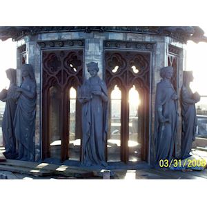 Look up through the skylight window and at the graphic panel on the right. The architect of The McManus, George Gilbert Scott, commissioned these lead goddess statues to decorate the grandest spire, on the west side of this building. In Greek mythology, it was believed that “The Muses” were responsible for inspiring science, literature and the arts through the creativity of poets, artists, musicians and scientists. In total, eight muse figures were commissioned for The McManus. Each Muse carries a symbolic object: a harp for music and literature, a compass for science and mathematics, a globe for science and geography, a rock for science and geology, a mallet for art and architecture, a star globe for astronomy, and an artist’s palette for art and painting. Specifically for Dundee, one figure holds a model of The McManus itself! Now please enter the “Dundee and The World” display, for the next stop on the tour.