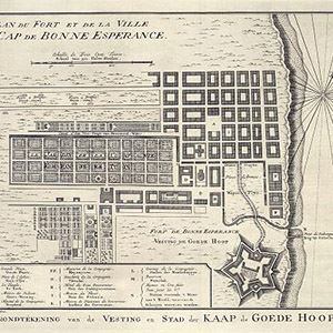 In het midden van deze plattegrond van Kaapstad zien we de Kompanies Tuin, ofwel de tuin van de Verenigde Oost-Indische Compagnie, de VOC. Deze tuin was in de eerste plaats bedoeld om de bemanning van de VOC halverwege de reizen naar Azië van vers voedsel te voorzien. Maar het klimaat aan de Kaap blijkt zo geschikt voor het telen van groente- en fruitsoorten dat de Kompanies Tuin al snel een internationale reputatie verwerft. Schepen uit alle windstreken brengen steeds nieuwe soorten mee, zoals komkommers uit Indië, bananen uit Zuid-Azië, thee uit Japan en watermeloenen uit Brazilië. Ook komt er een tuin met medicinale planten. De tuinen van de Compagnie krijgen bekendheid om hun variëteit en hun adembenemende ligging aan de voet van de Tafelberg. De voedselproductie van de tuinen wordt gaandeweg overgenomen door boerenbedrijven aan de Kaap en omstreken. Boeren uit de Nederlandse Republiek vestigen zich aan de Kaap en leggen beslag op steeds meer land waardoor de bewegingsvrijheid van de lokale bevolking, de rondtrekkende Khoi, steeds meer wordt ingeperkt.
