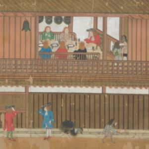 Deze Japanse schildering op zijde geeft ons een inkijkje in de handelspost Deshima, gelegen in de baai van Nagasaki. Op dit minuscule eilandje –ter grootte van de Dam in Amsterdam– mocht de VOC 150 jaar lang als énige buitenlandse onderneming handel drijven met Japan. Eén keer per jaar konden Nederlandse schepen hier aanleggen. Alleen in uitzonderlijke gevallen mochten Japanners het eiland betreden; en omgekeerd mochten Nederlanders alleen onder zeer specifieke omstandigheden het eiland verlaten. Deshima was voor Japanners hét venster op de westerse wereld. De schildering toont de Nederlandse handelspost buiten het handelsseizoen want we zien vooral veel vrijetijdsbesteding. Dat lijkt een bewuste keuze van de kunstenaar want juist hierin verschilde de Nederlandse cultuur sterk met die van Japan. Zo wordt links op de voorgrond een soort badminton gespeeld. En in de middelste kamer boven vormen een cellist, een harpist en een violist een Europees klassiek ensemble. Midden vooraan zien we twee Nederlanders die elkaar begroeten door de hoed af te nemen. De Nederlanders worden uniform afgebeeld met een wit gezicht, lang roodkleurig haar en grote hoekige neuzen; eigenlijk net zo stereotiep als Europeanen destijds mensen uit Afrika en Azië afbeeldden. De donkergekleurde personen in de schildering zijn de Javaanse dienaren van de Nederlanders.